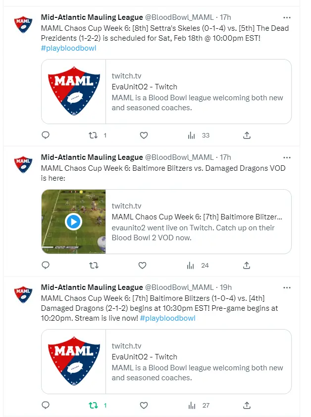 Finally, social media accounts are updated as needed. Twitter and Facebook will automatically post when a game has been scheduled. Facebook posts these as actual Facebook events. Twitch will be automatically updated with the title of the next scheduled game as well as updating the standings panel. Twitter, Facebook, and Discord will automatically post when a game has gone live. When a stream ends, those three platforms will post the video-on-demand of the game. Bluesky updates are currently done by hand.